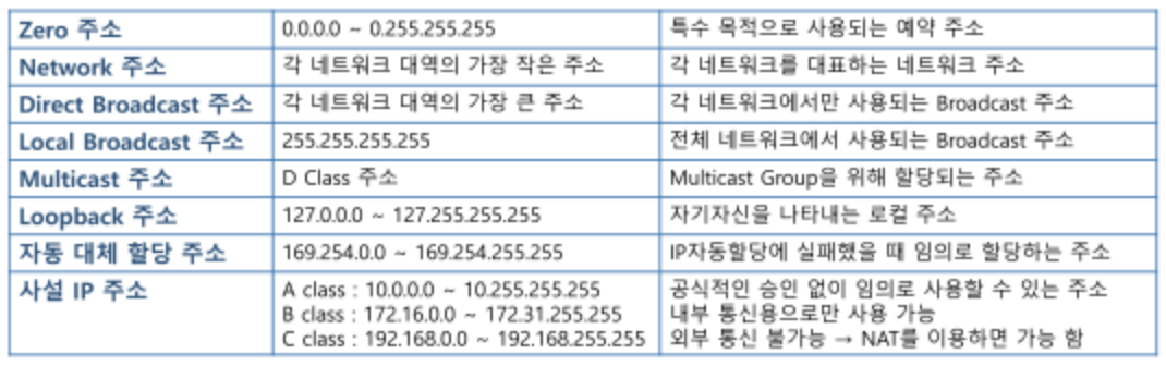 - 인터넷 통신을 위해 host에게 할당할 수 없도록 지정되어 있음