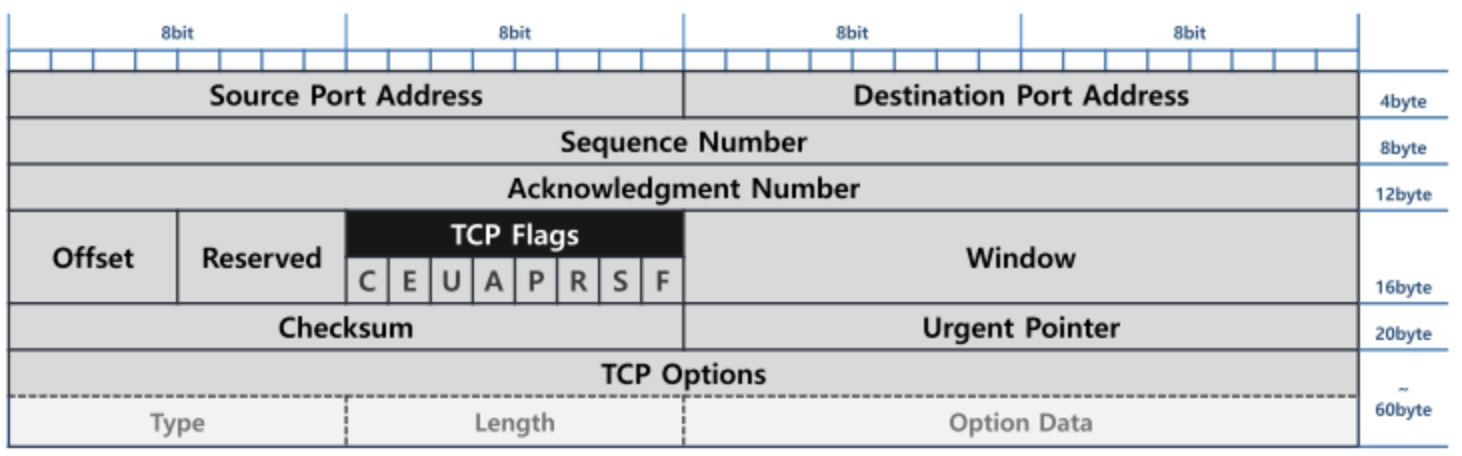 - 연결 제어용 TCP 메시지의 크기는 1byte로 취급함 - Offset (4bit)