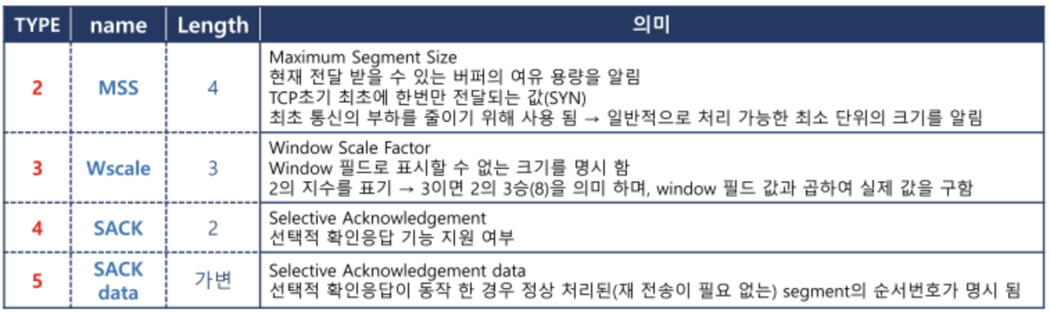 : 긴급 데이터의 마지막 위치 - TCP Option (0 ~ 40byte)