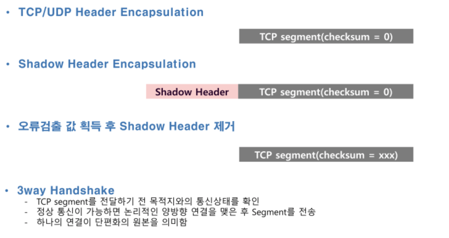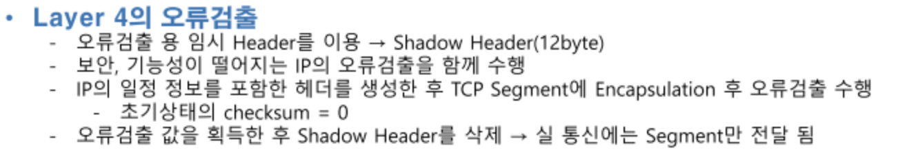 : Datagram 전체와 3계층 정보 중 일부분에 대한 오류검사 값, shadow header를 구성하여 오류검출 수행함