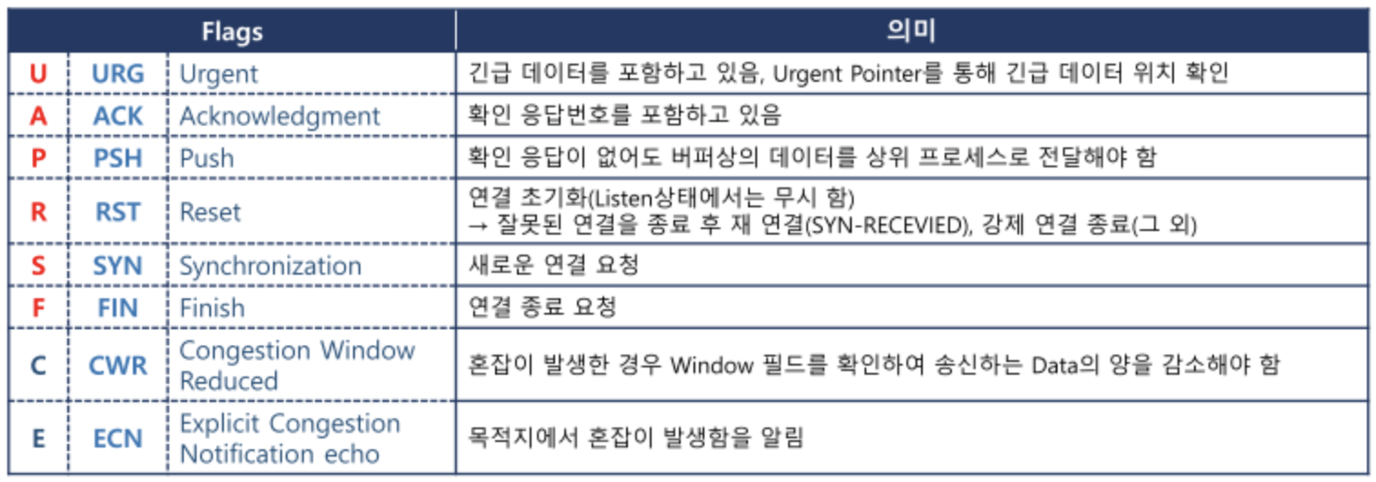 : TCP 메시지의 종류를 명시함 - 연결설정, 종료, 초기화, 데이터 전송 제어, 흐름제어 등을 지시하는 메시지