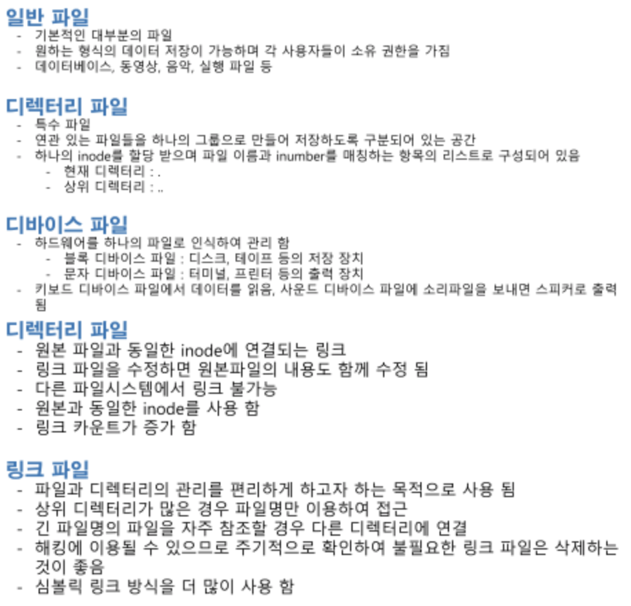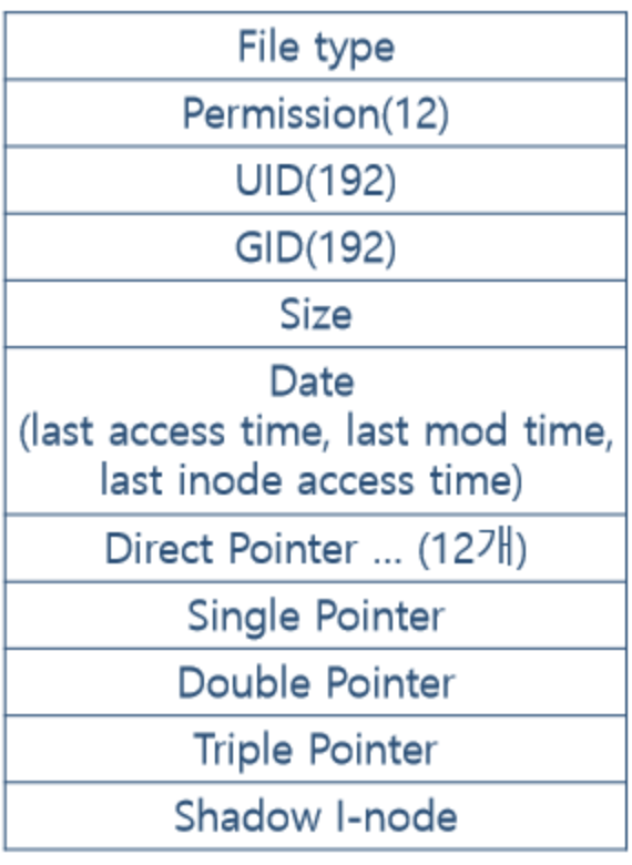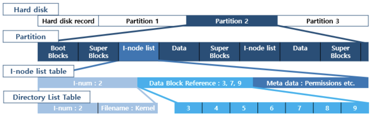 - I-node list table: 하나의 파일 시스템에서 파일이나 디렉터리들의 I-node 정보 모음