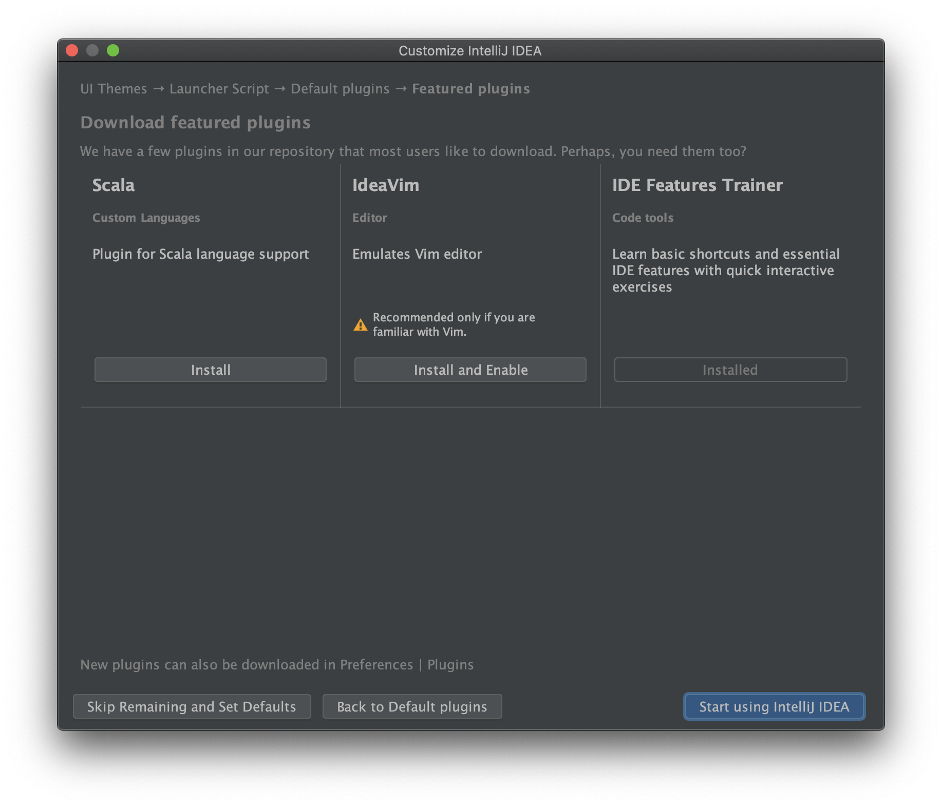 (5) 추가 플러그인 설정 : '(커스터마이징) → Start using intelliJ IDEA'을 클릭합니다.