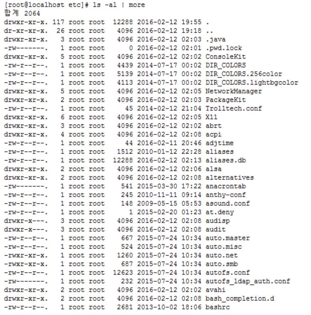 : 많은 출력 결과를 화면 사이즈에 맞게 한 페이지씩 출력, |를 이용하여 다른 명령의 결과를 처리할 수 있음