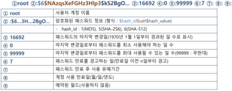 | /etc/shadow | 암호화된 패스워드 및 정책 설정 정보 |