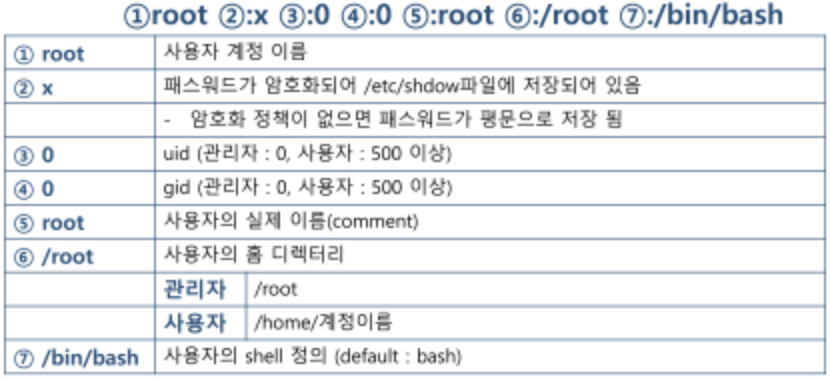 | /etc/passwd | 사용자 계정의 기본정보 |