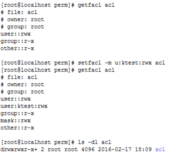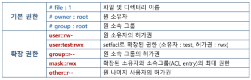 - 파일 및 디렉터리에 특정 사용자/소속 그룹의 권한을 부여할 때 사용함