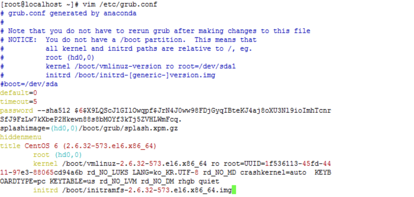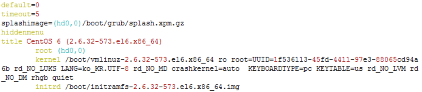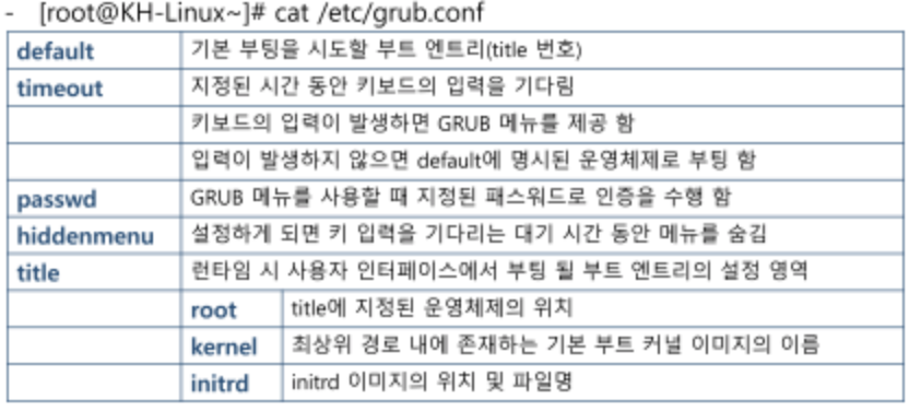 - 부팅 단계에서 GRUB프로그램이 grub.conf 파일 내용을 읽어간 후 동작을 수행함
